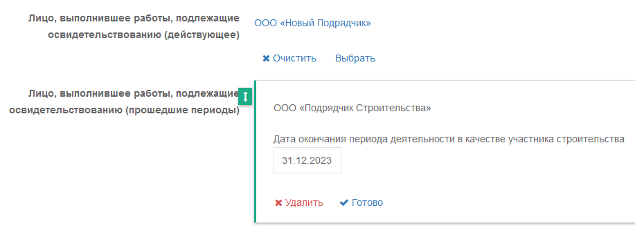 А ниже, в блоке Застройщик (технический заказчик, эксплуатирующая организация или региональный оператор) (прошедшие периоды) указать предыдущего Заказчика, со сроком окончания его работы (в случае смены Подрядчика выбрать аналогичные поля для него)