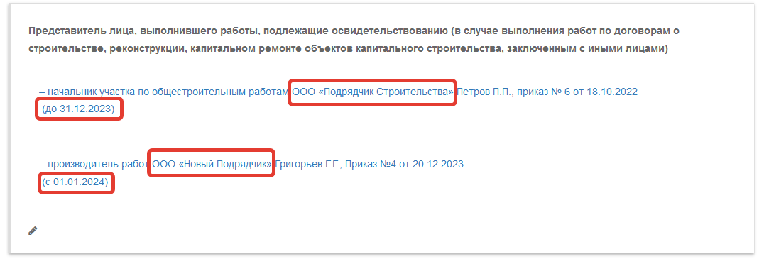 б) На странице Информация об объекте строительства в блоке единых представителей (в блоках для актов по формам приказов 470 и/или 344/пр) выбрать представителей как старого участника строительства, так и нового одновременно. Система в конкретный акт будет автоматом подставлять только представителей с действующими на нужную дату сроками полномочий.