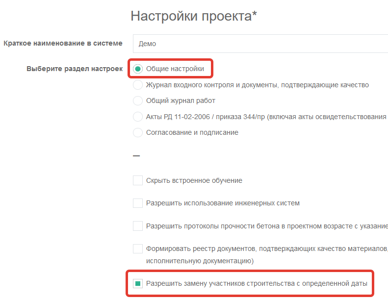 1) На форме Настройки проекта в разделе Общие настройки включить галочку Разрешить замену участников строительства с определенной даты.